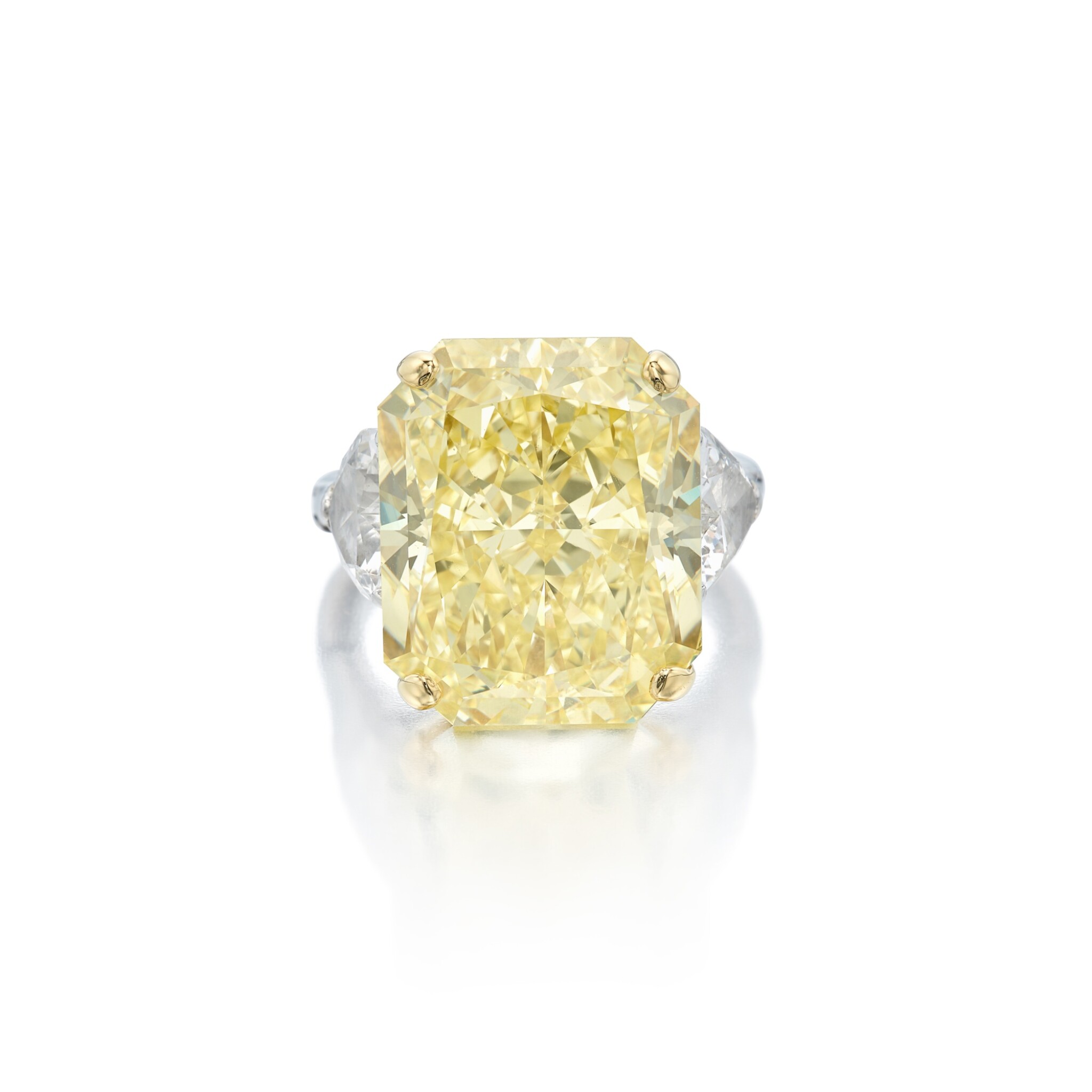 The restrained metalwork is deliberately secondary, so the fancy colour diamonds and their Fancy Yellow character define the mood and identity of the ring entirely.
